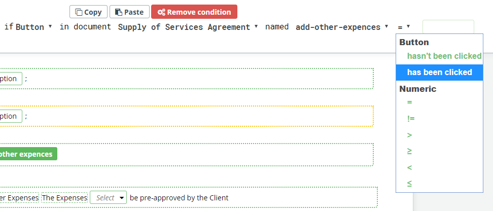 Another condition you can now set up: a text or a clause will be added to a document only if the user clicks to a button X times, including other mathematical operators. Also, conditions “has been clicked” and “hasn’t been clicked” were modified. From now on, they respect minimal values of Buttons (explained below).