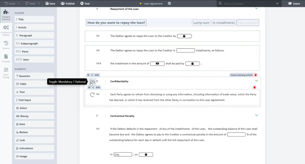 Occasionally, a user may need to remove Clauses from a document. When automating a Template, it is possible to set some Clauses as Mandatory, meaning that they cannot be removed from a document draft, and others as Optional, which can be removed from a document draft by a user.