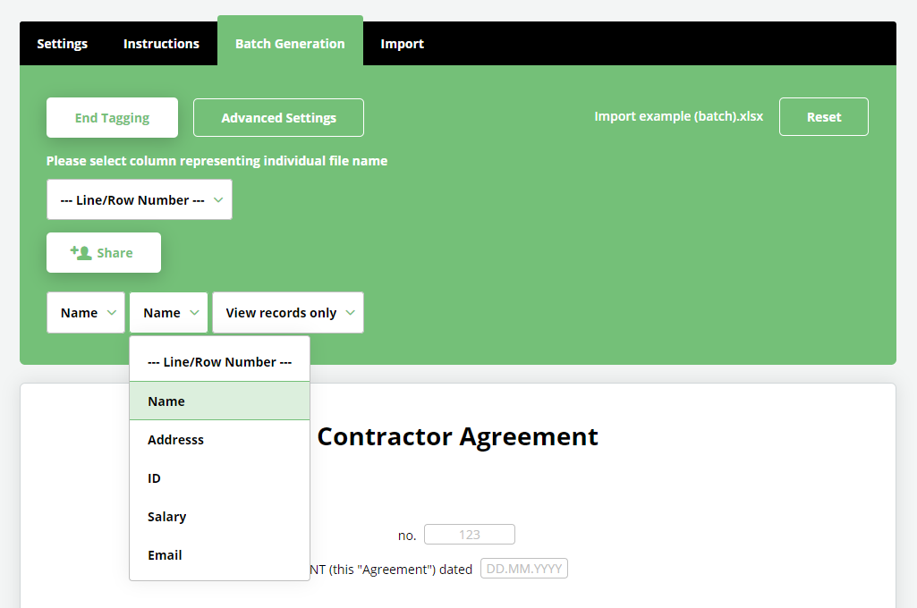 You can automatically share individual Legito document created through Batch Generation with different users. You can match users with your Excel/CSV sheet by their email, name, Legito user ID, position or company ID.