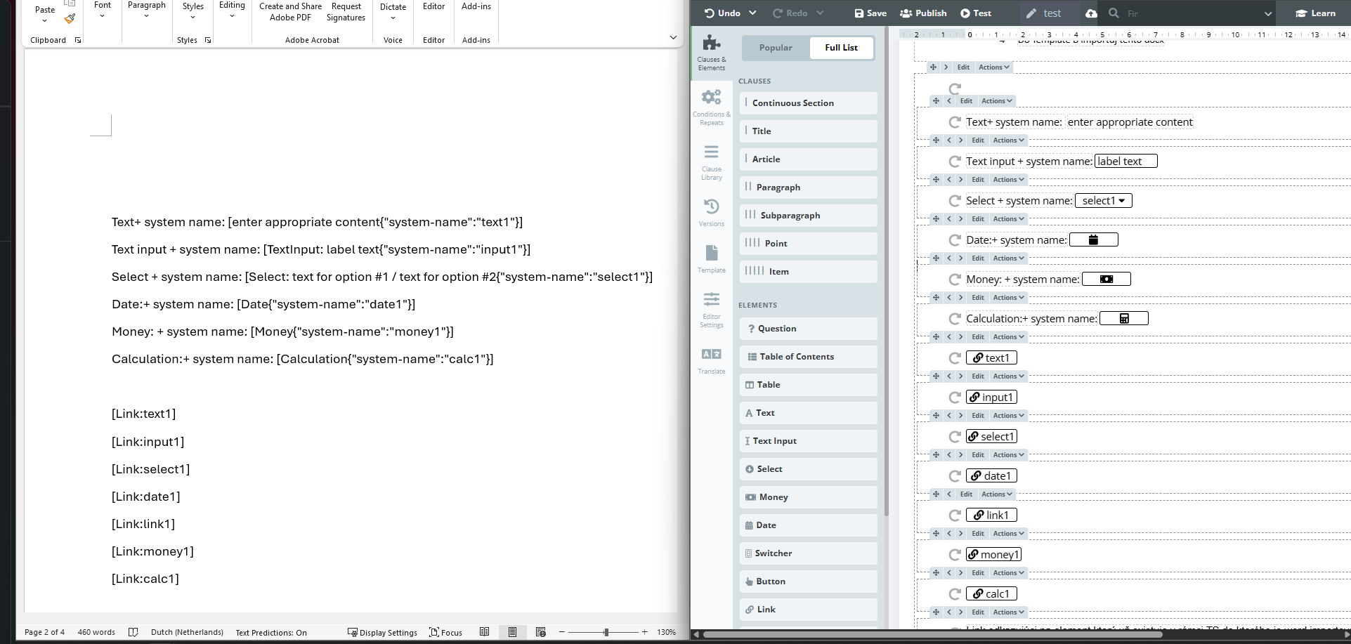 To significantly reduce manual work when converting Word documents to automated Legito Templates, we built an AI tool to identify where Input-type and Selection-type Elements are required, and it can even automatically build some logical dependencies into the template.