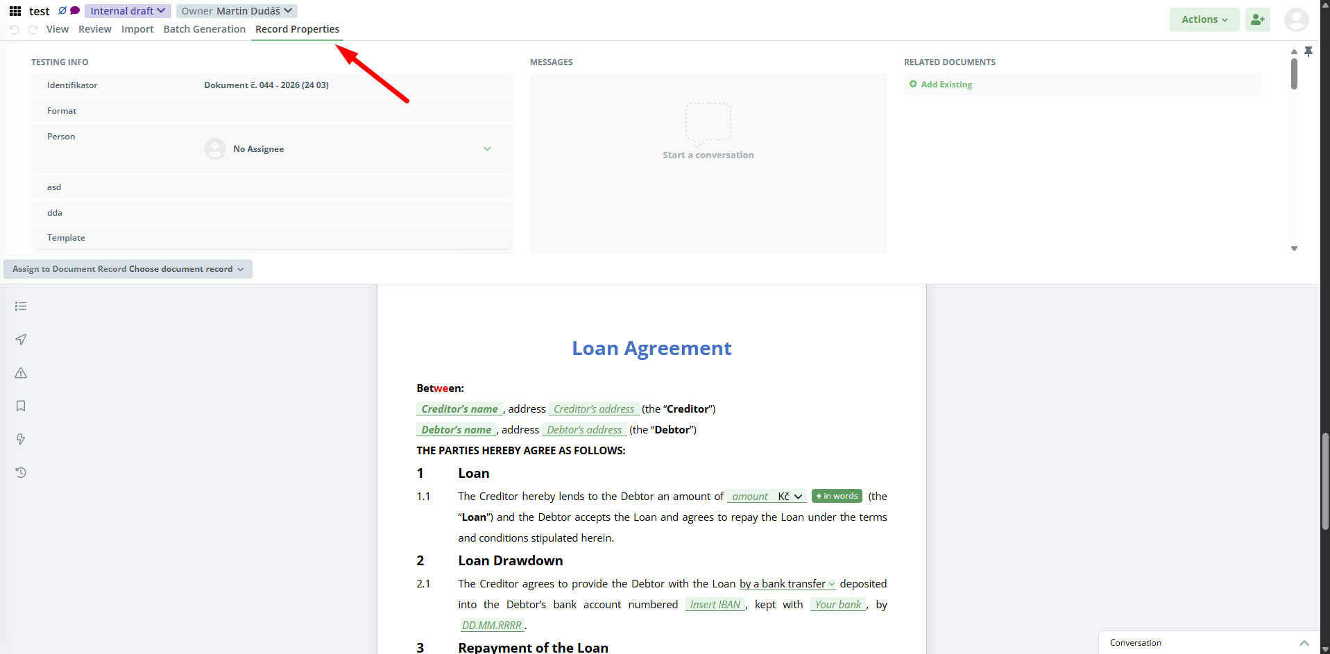 To access Document Record details from Document Editor, click on the Record properties tab in the top menu.