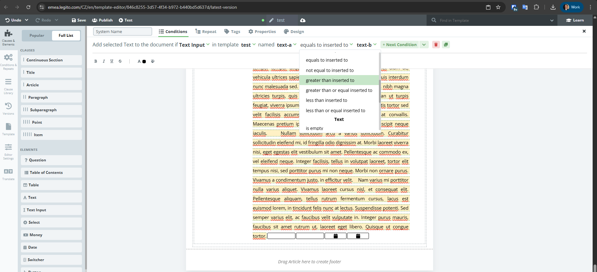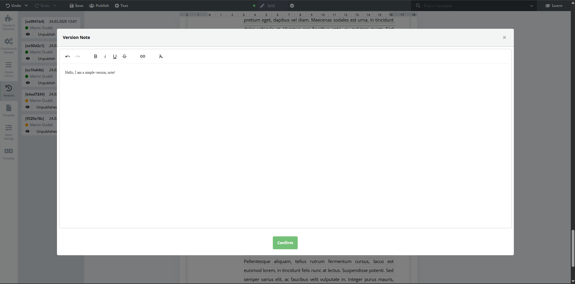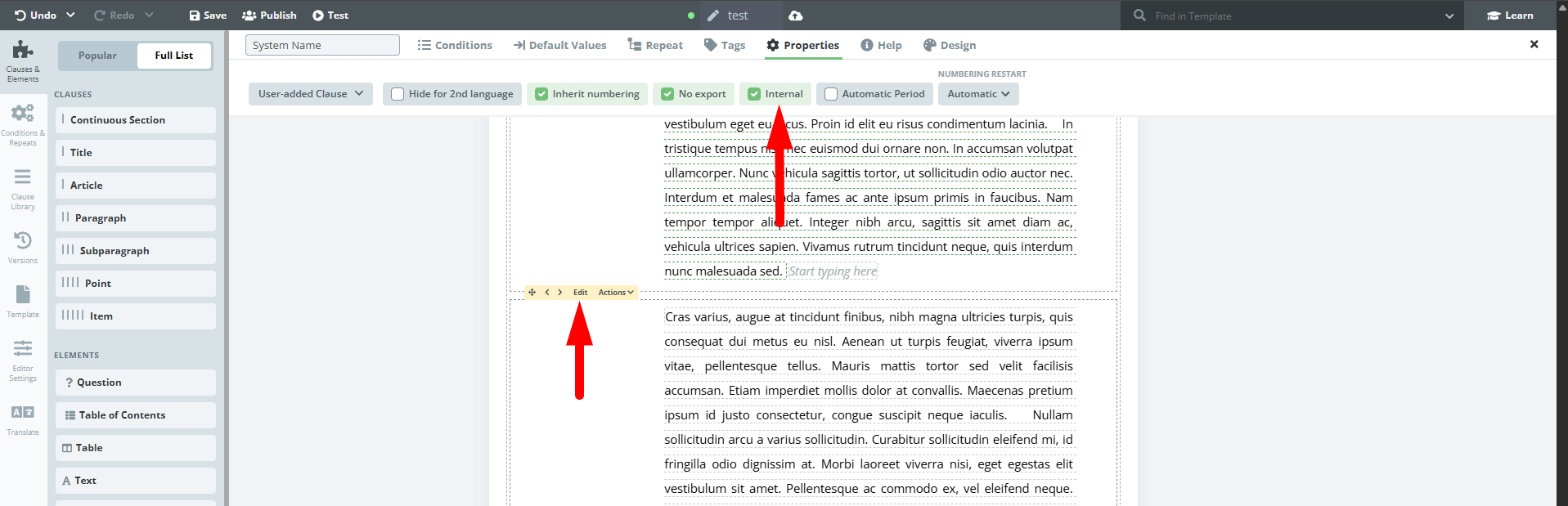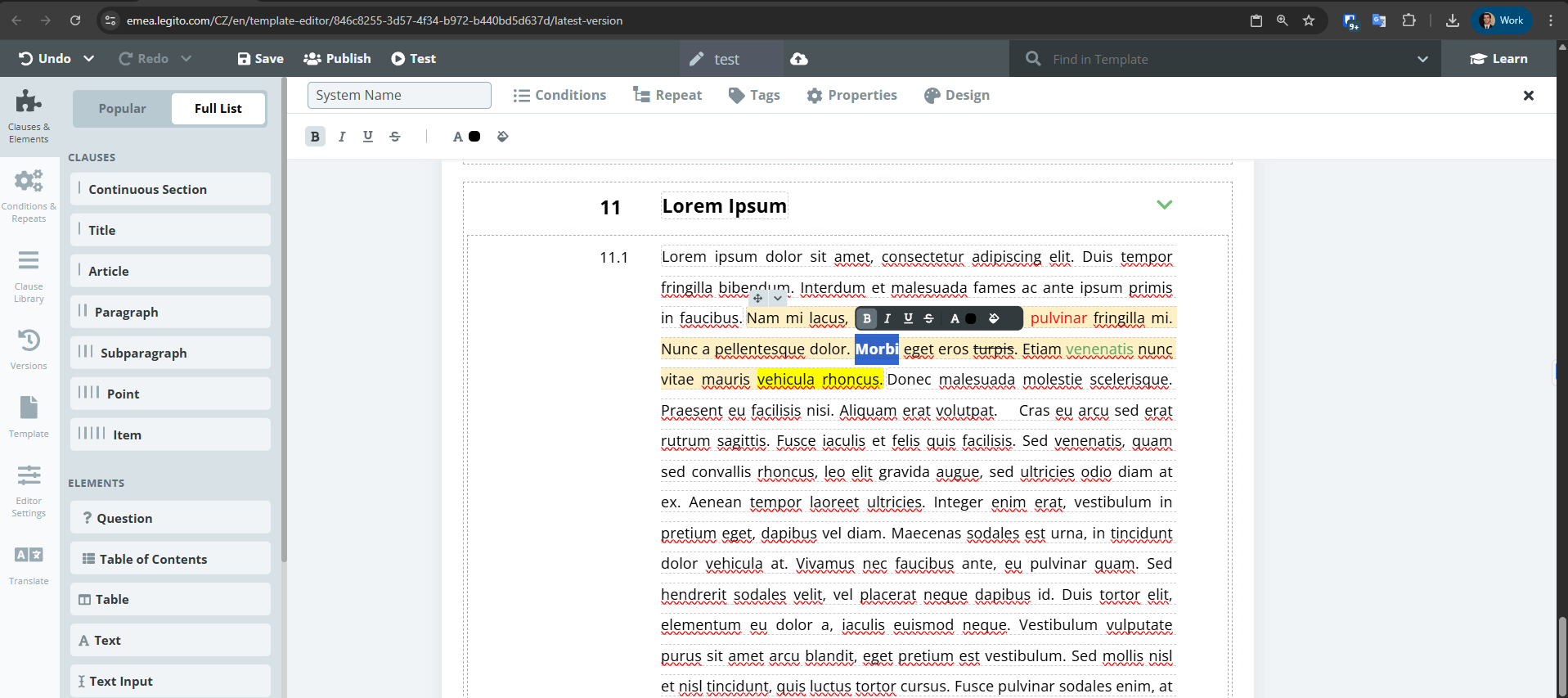 Legito now supports character level formatting, meaning it is possible to format different parts of the same element separately. Right now, character level formatting is available for the text element only. The option to set character level formatting can be found under the top option bar in the Template Editor when it appears upon selecting any text element. To make editing quicker, a new formatting bar appears directly above the text element after any text is selected. Formatting settings for clauses remain unchanged.