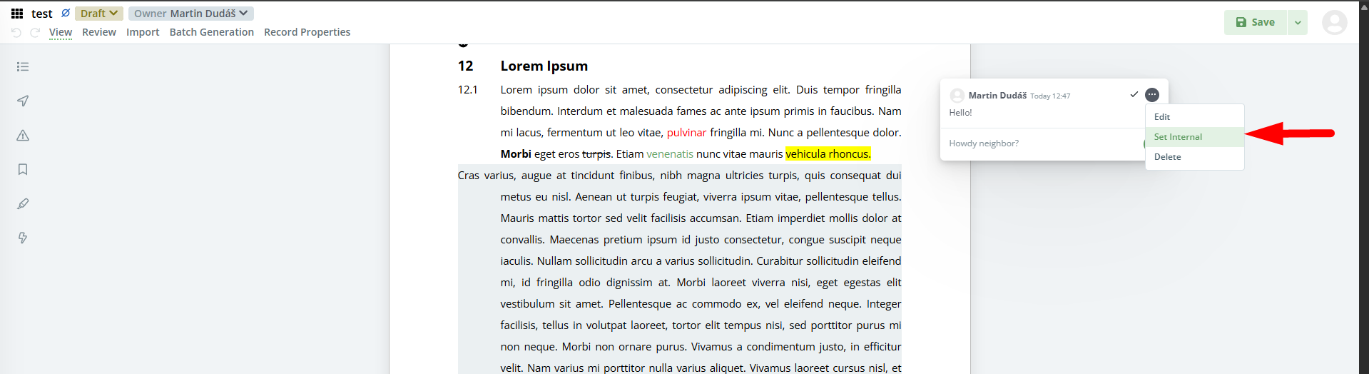 Comments can also be marked as internal and behave in the same way – only users with permission to “View Internal Documents” can see them. When the first comment is marked as internal, all the following comments in the thread are treated as internal as well.
