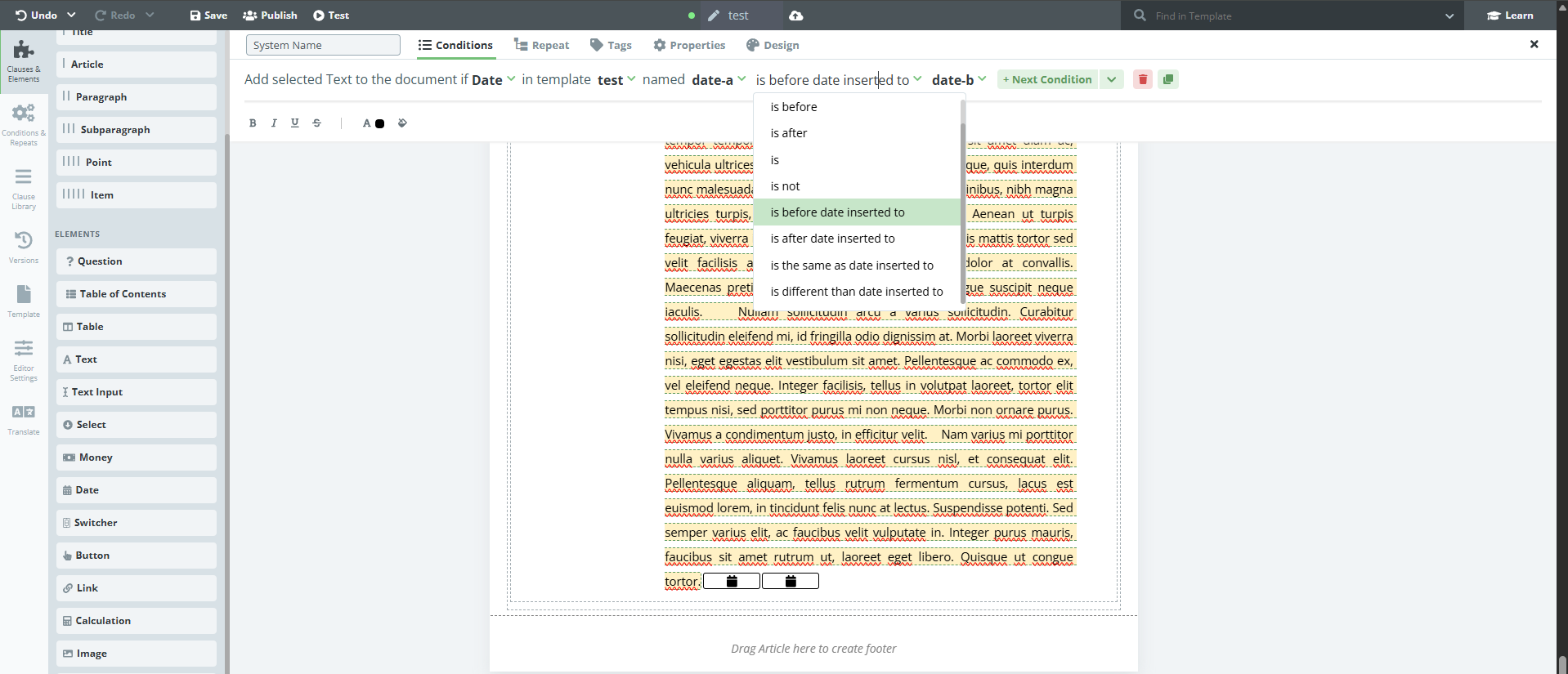 New conditions have been added that allow comparison between two date elements. These new conditions can be applied to any element.