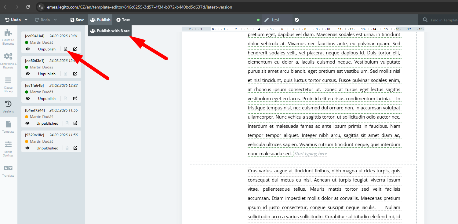 Several changes have been made to Follow-up instructions. In addition to appearing in emails containing the links to generated documents, this special type of Template will now appear under the Documents in Document Editor, which appears differently than other Template types. Standard Legito Template publication principles will apply to the Follow-up instructions so that instructions are displayed to all users when published.