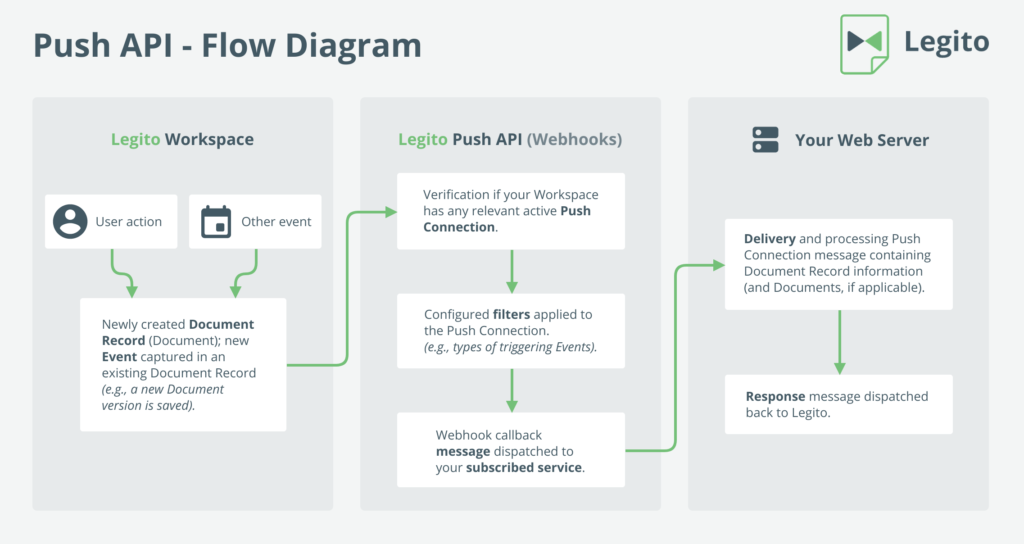 Legito’s Push API now enables your application’s web server (webhook listener) to receive instantaneous automated messages containing Document Record details (including Documents and Files) that are triggered by any Document Record Event. A Triggering Document Record Event may be any of the Event types captured by Legito’s Document Timeline (Audit Trail).