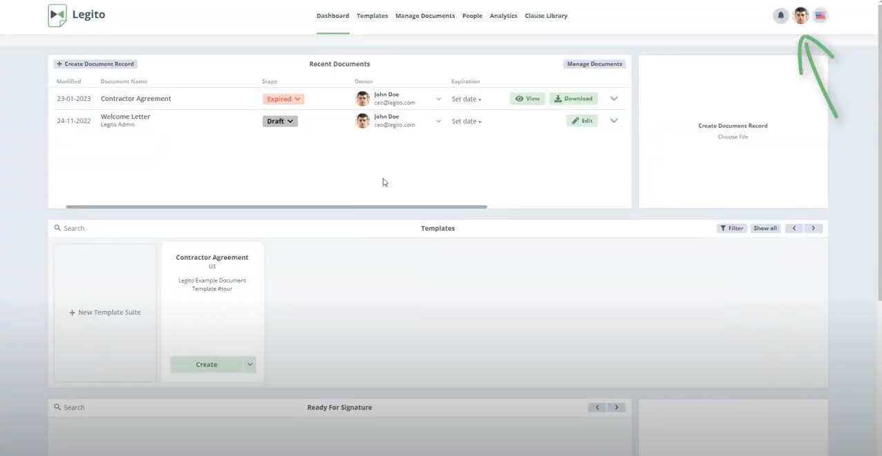 • Go to settings – Click the icon with your initials on the right-hand side of the top menu on any main landing page, and choose “Settings” from the dropdown