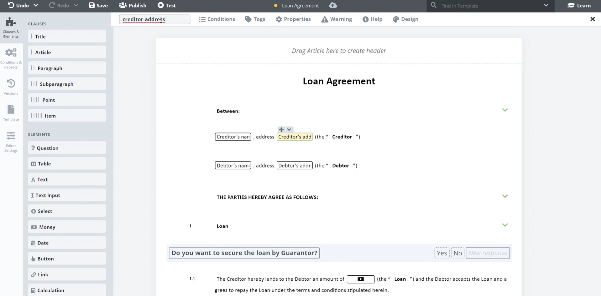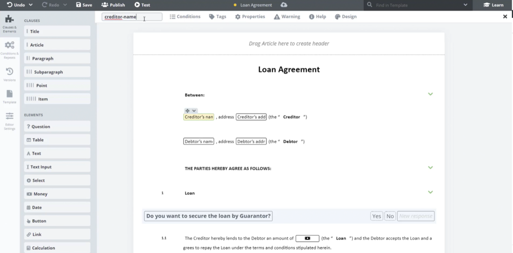 Now we will apply a Link Element to reference text added by a user in a previous section of the Template, thereby populating texts across the document (or documents if necessary).