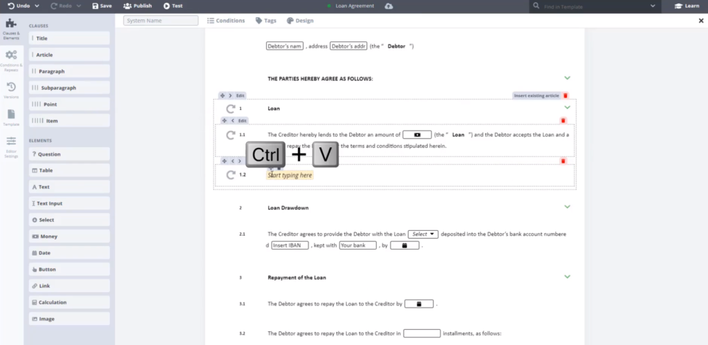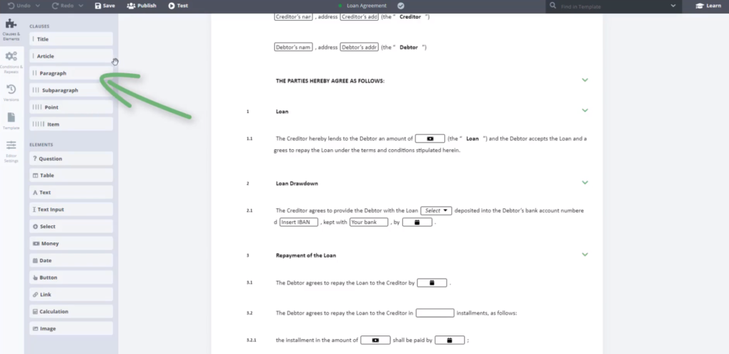 For example, if you move your cursor over section 1 (Loan), you will note the dotted line border that appears around the Article in section 1 the Paragraph 1.1. A menu of three buttons will appear on each Clause container at the top left, with a delete button on the top right.