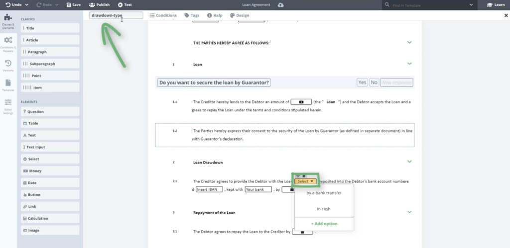 In essence, what you are doing here is creating a logical dependency. The text in and around these four Elements will only appear in the document if the debtor chooses to receive the loan “by bank transfer”. If the Debtor decides to receive the loan by cash, then the text will not appear in the Document (Loan Agreement) created from this template.