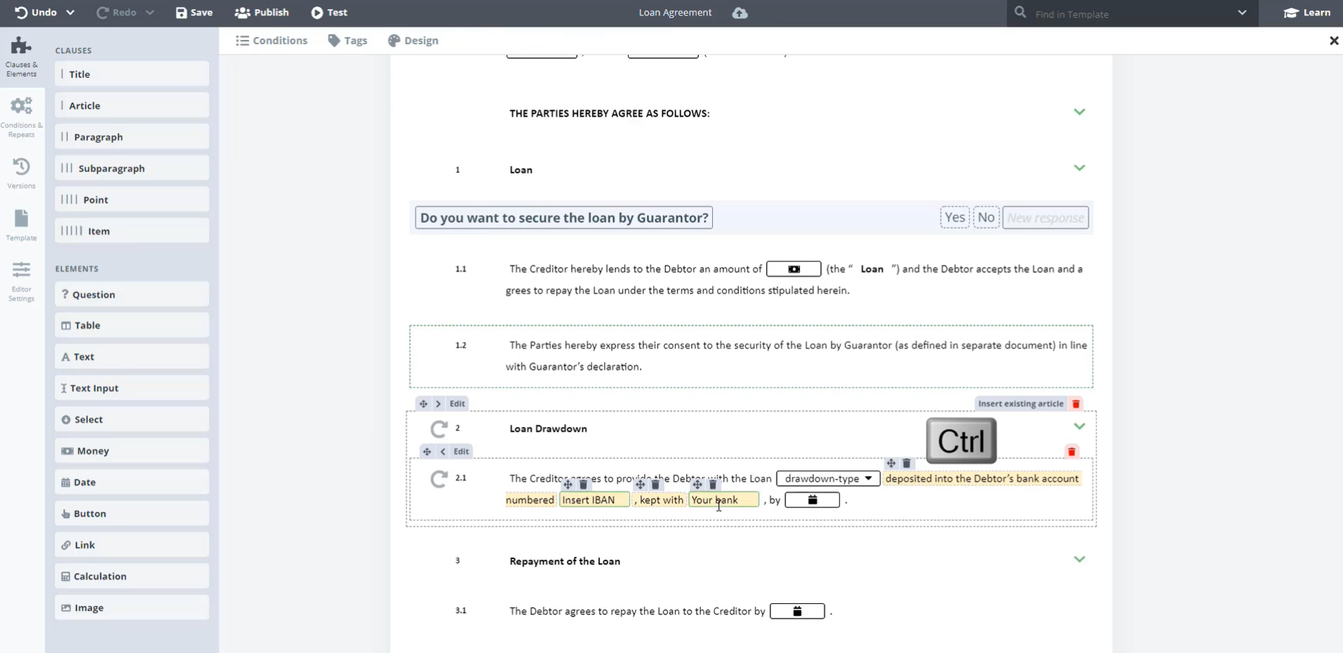 In essence, what you are doing here is creating a logical dependency. The text in and around these four Elements will only appear in the document if the debtor chooses to receive the loan “by bank transfer”. If the Debtor decides to receive the loan by cash, then the text will not appear in the Document (Loan Agreement) created from this template.