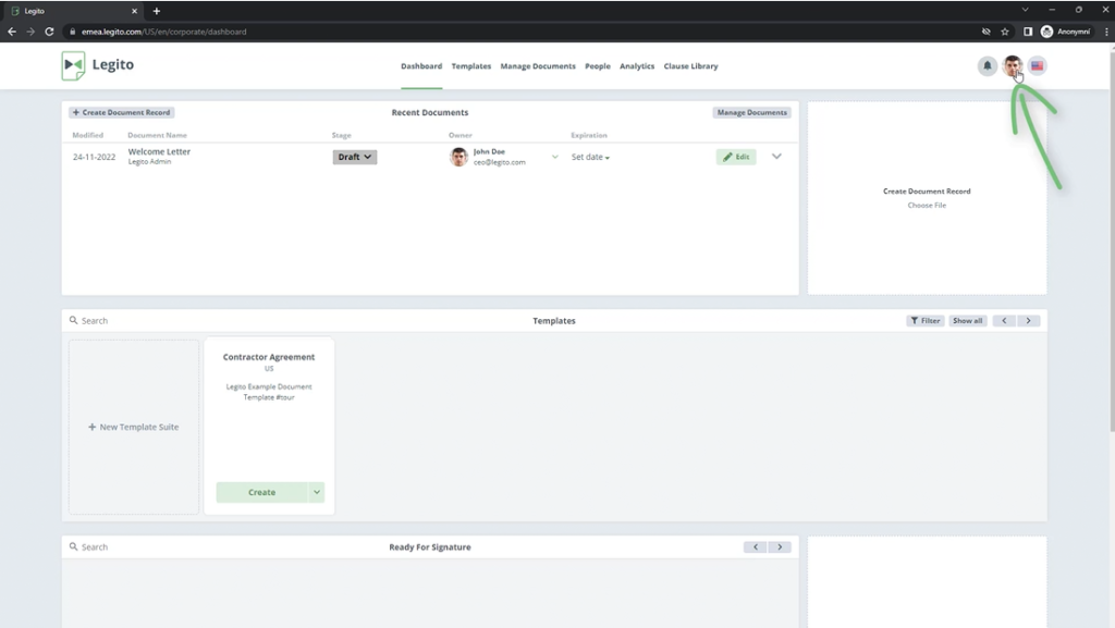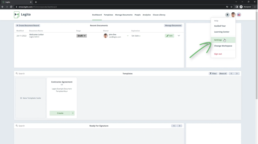 Click the icon with your initials on the right-hand side of the top menu on any main landing page,