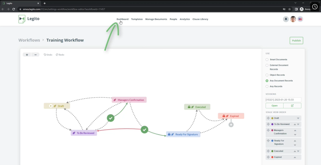 Open the Assigned Workflow dropdown in the right menu and choose Training Workflow.