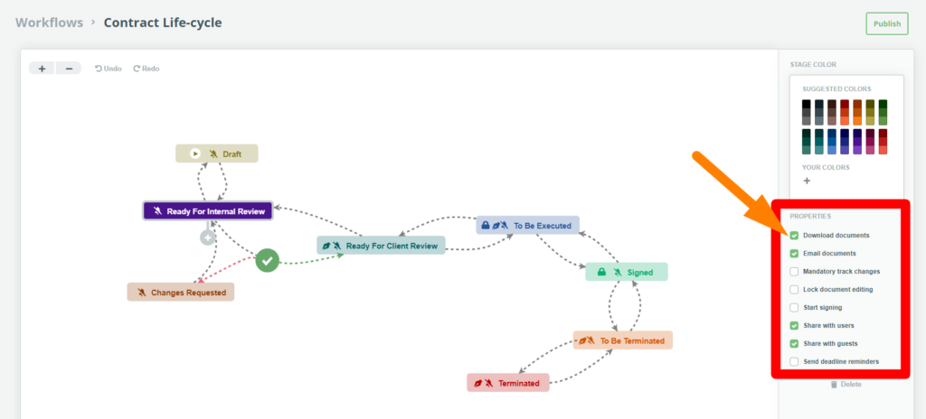 – eSignatures (Start signing): Rules on which Stages the eSignature process may begin can be arranged through adjusting Stage properties in Workflow Editor